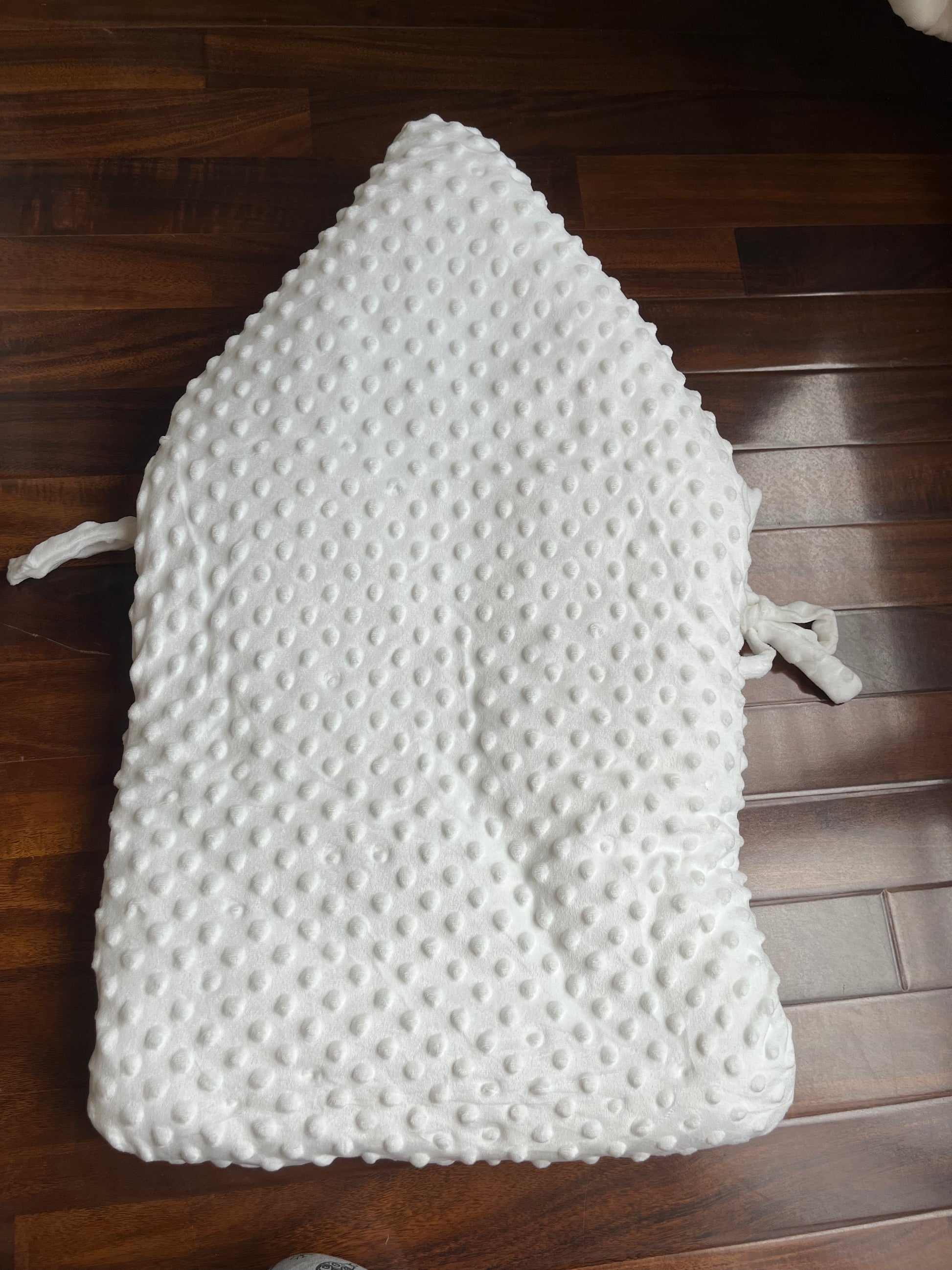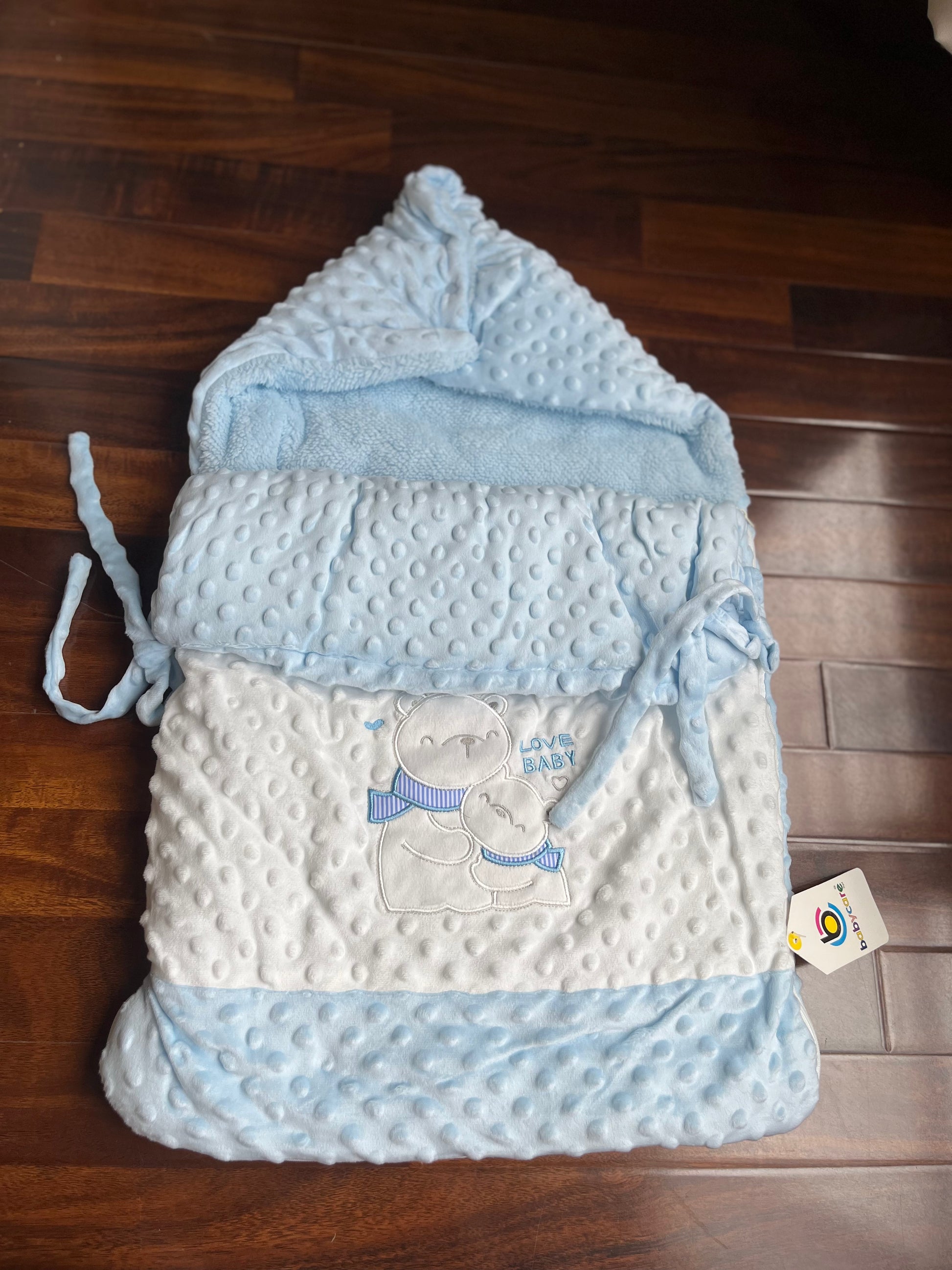 It is made with a soft, plush fabric, and features a hood and ties for securing the baby.