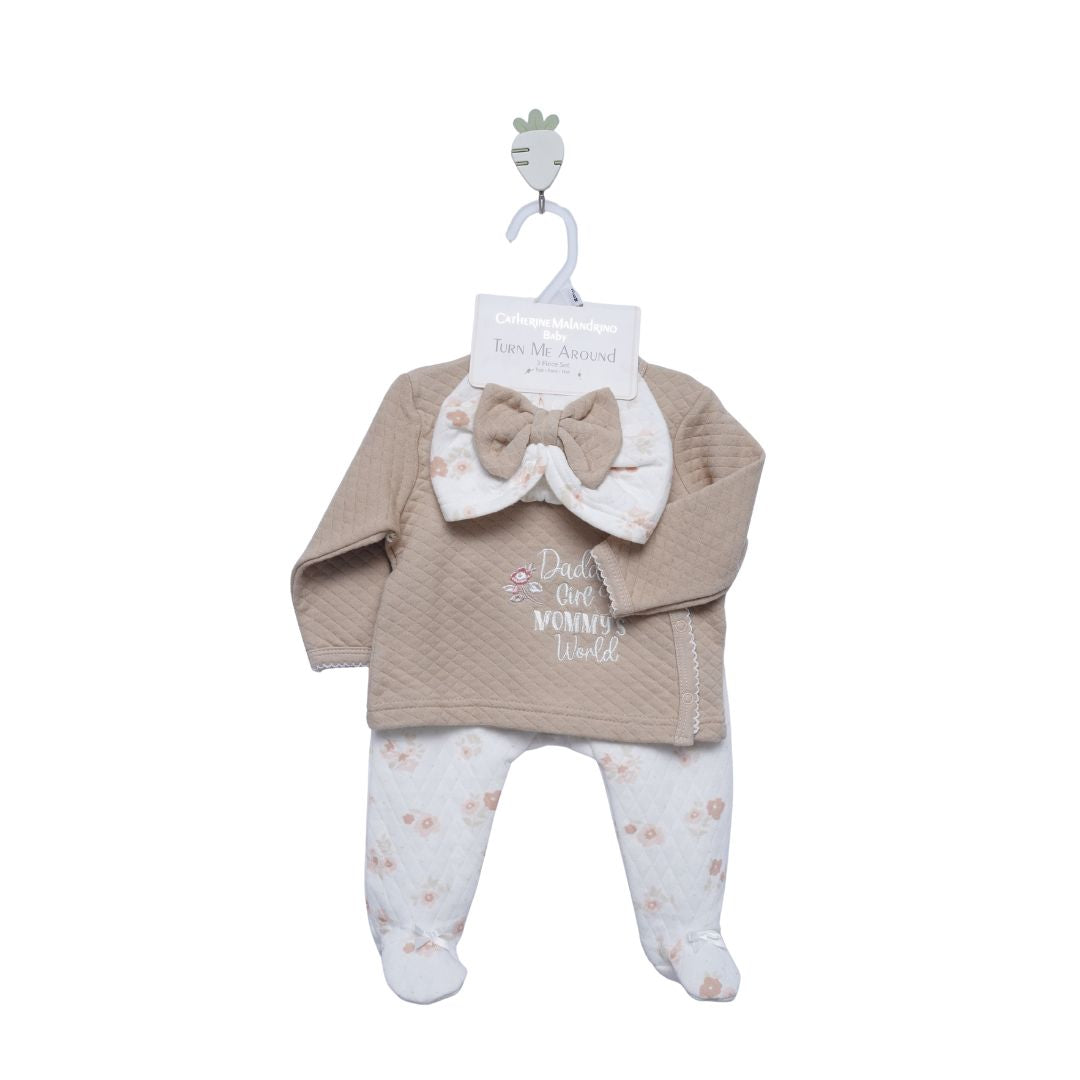 This expert-crafted baby pajama suit features a three-piece set including a brown-beige quilted top, floral patterned pants, and a charming hat adorned with a front bow. Designed for comfort and style, the quilted top provides warmth while the soft pants allow ease of movement. The cute hat completes the outfit, offering gentle protection and an adorable finishing touch for your baby’s wardrobe.