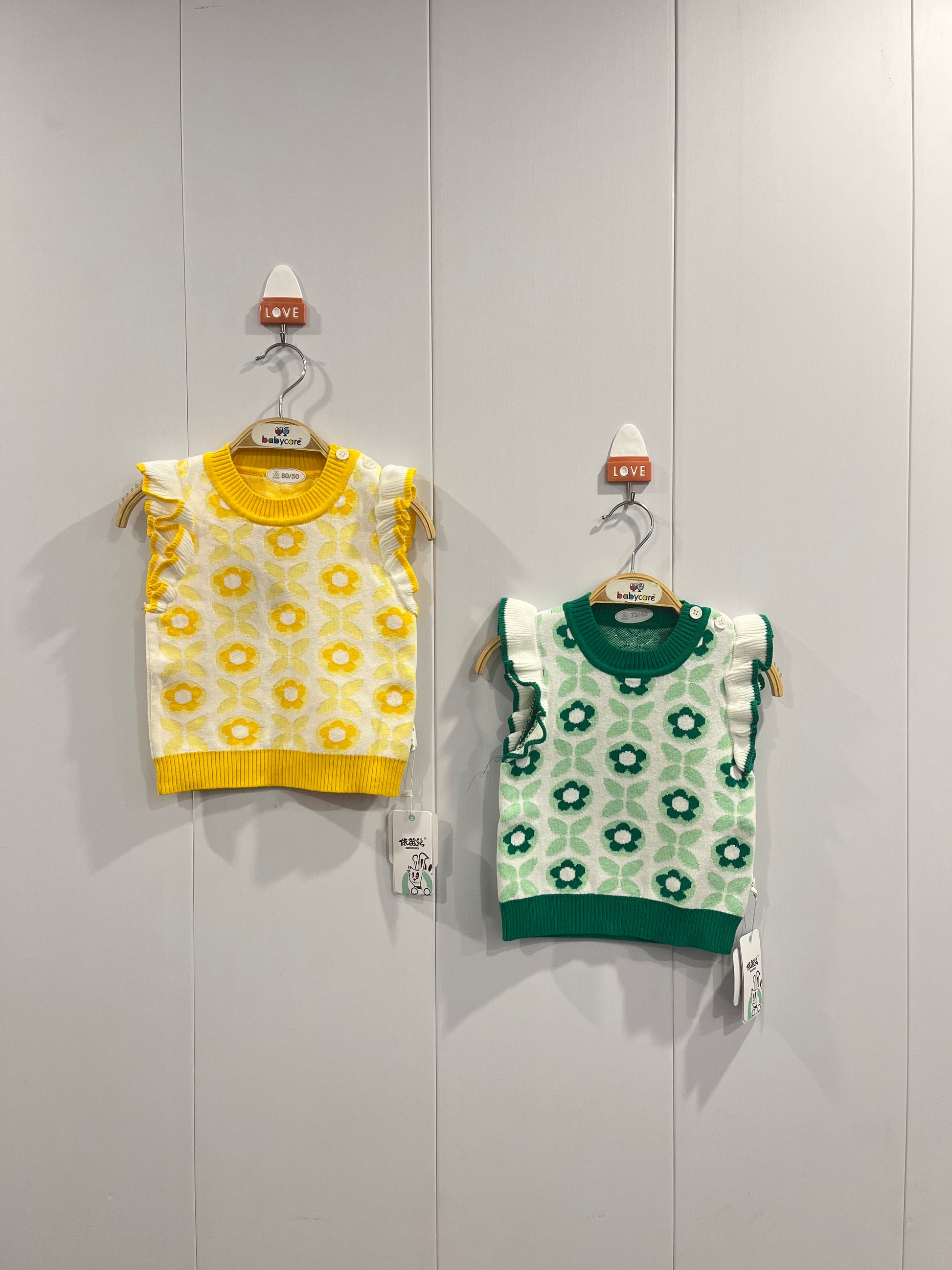 This sleeveless baby sweater features expert knitting combined with a warm fleece lining to provide cozy comfort while allowing freedom of movement. Offered in vibrant yellow and green, it’s an ideal layering piece for added warmth without bulk, ensuring your little one stays comfortable and stylish in cooler weather.