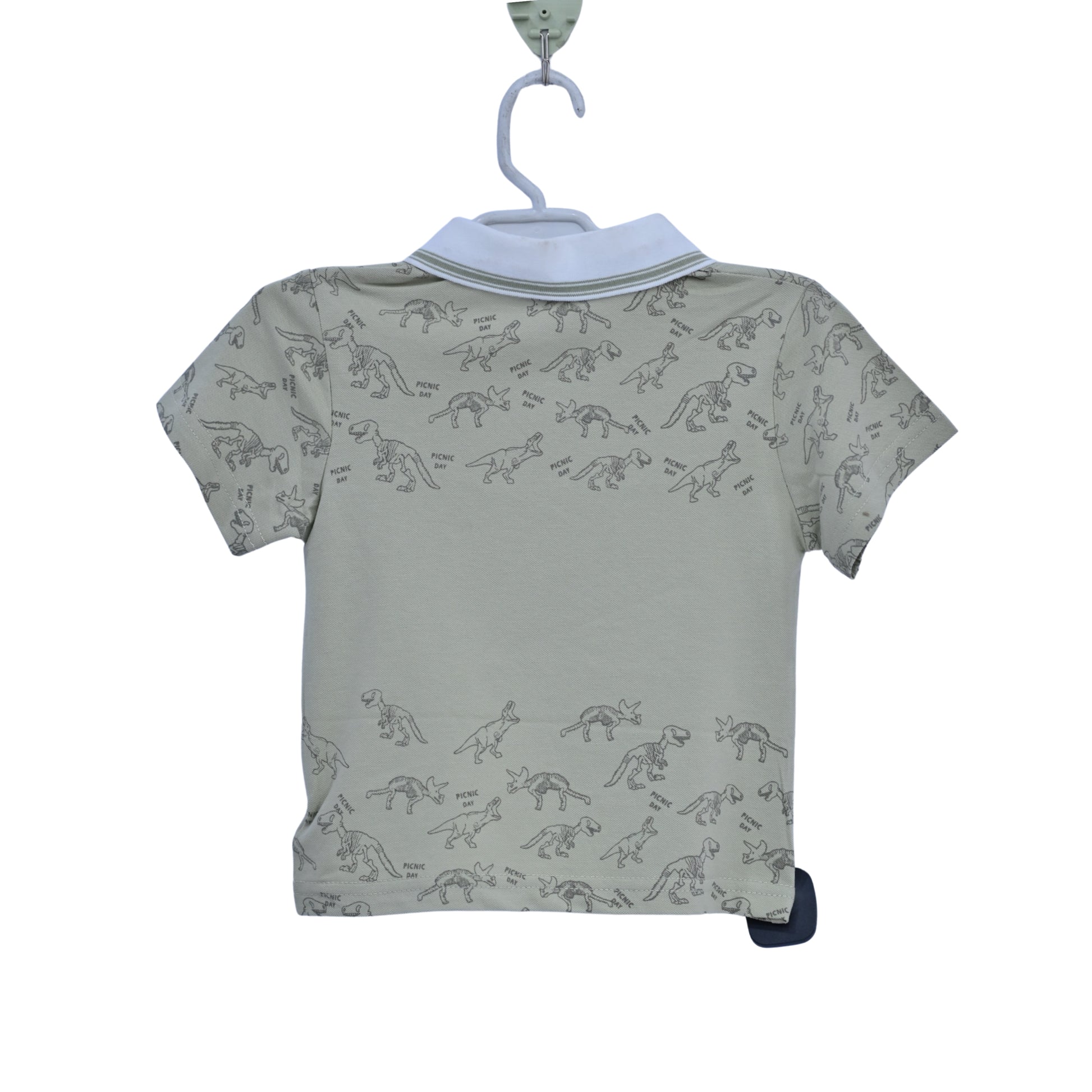 Let your little adventurer explore in style with this khaki polo shirt featuring a fun all-over dinosaur sketch print and a bold embroidered dino badge on the chest. The crisp white collar with subtle green stripes adds a refined touch, making it perfect for both casual playdates and smart outings. Made from soft, breathable fabric, this shirt combines comfort with playful charm — ideal for young dino fans ready for a “picnic day” adventure!