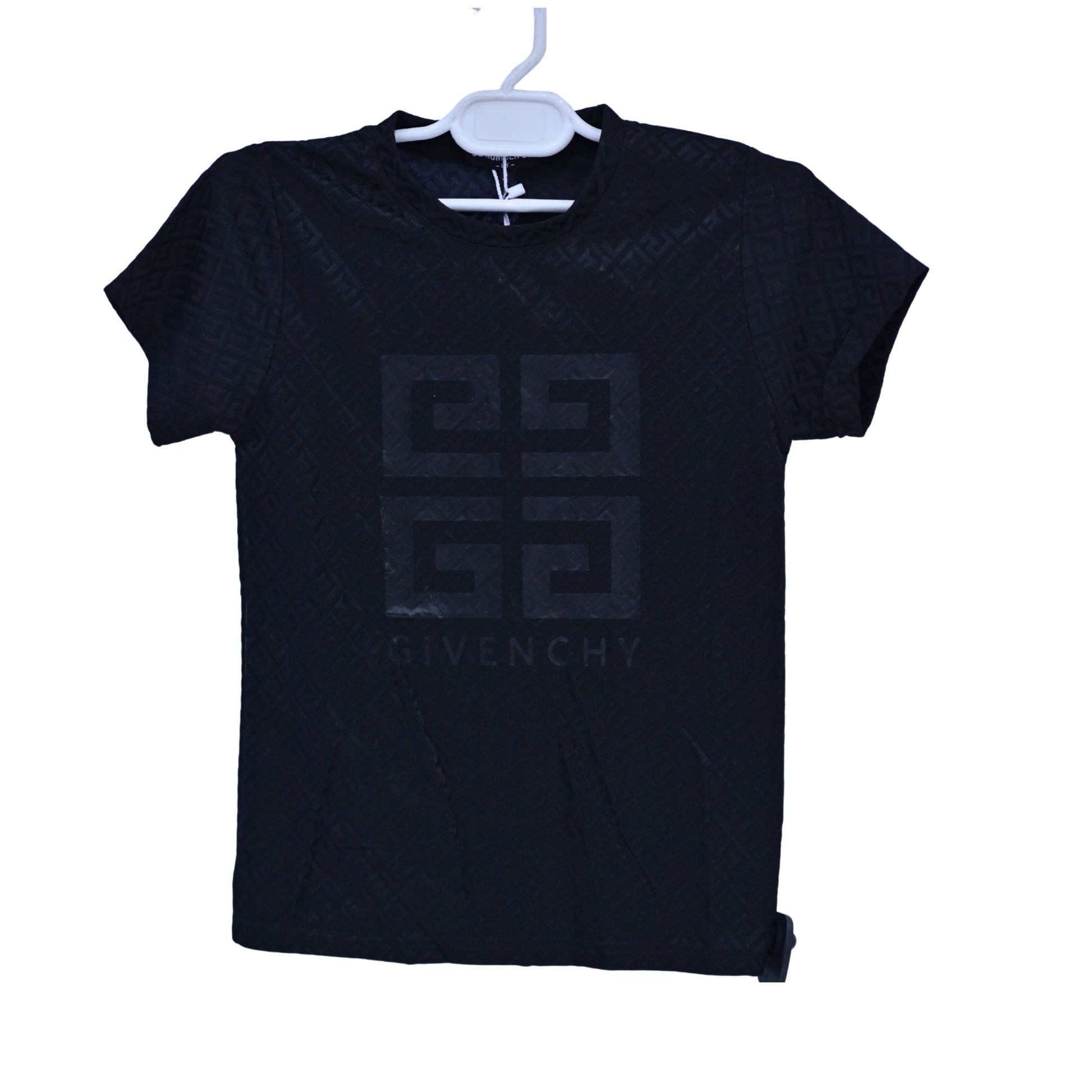Elevate your wardrobe with this sleek black t-shirt featuring a subtle all-over embossed pattern and a bold central logo inspired by the iconic Givenchy design. Made with premium fabric for a soft and comfortable fit, this tee combines luxury and minimalism. Perfect for casual chic outfits or layering under jackets for an upscale streetwear look.