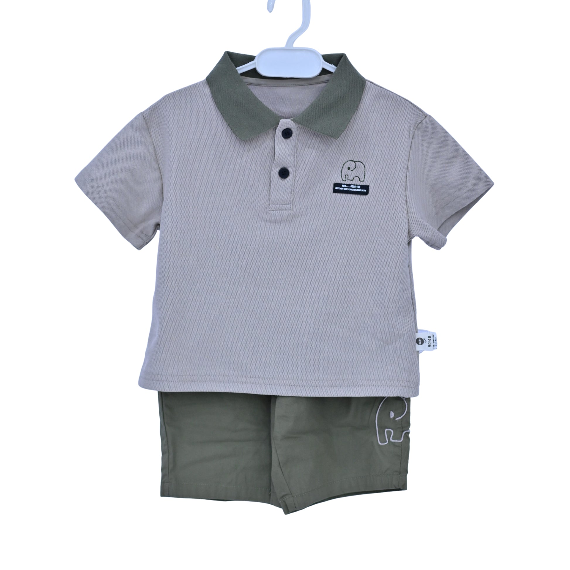 Keep your little one stylish and comfy with the Little Explorer Elephant Polo Shorts Set. This charming outfit features a beige short-sleeved polo shirt with a contrasting olive green collar and button placket. A cute embroidered elephant logo on the chest adds a playful touch. The set includes matching olive green shorts with a coordinating elephant graphic near the hem, completing a look that’s perfect for both playdates and casual outings. Made with breathable, soft fabric for all-day comfort and easy movement.