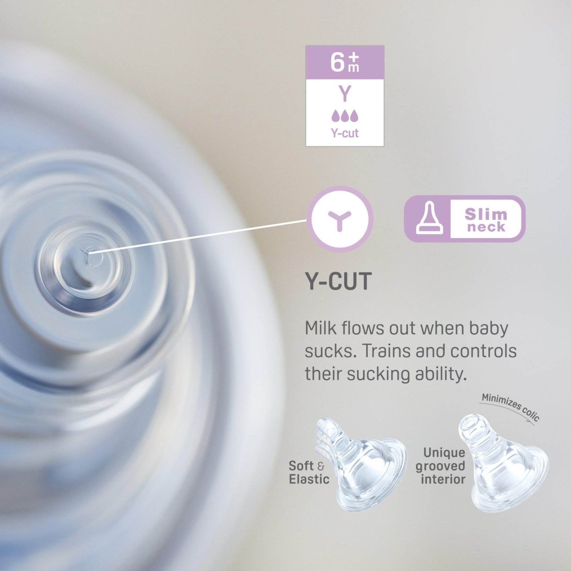 Backed by over 60 years of research on baby’s natural suckling motion, our Flexible Slim Neck Nipple is so soft it flexes to the movements of babies’ mouth and bends naturally to baby’s mouth movement. The nursing bottle’s Air Ventilation System (AVS™) reduces intake of gas, a potential cause of colic. For 4+ months. The opening of the nipple is round-cut which allows milk to flow out consistently and gradually. Newborns still have minimal jaw muscles movements at this age, thus the nipple is designed to support their sucking ability at this age.