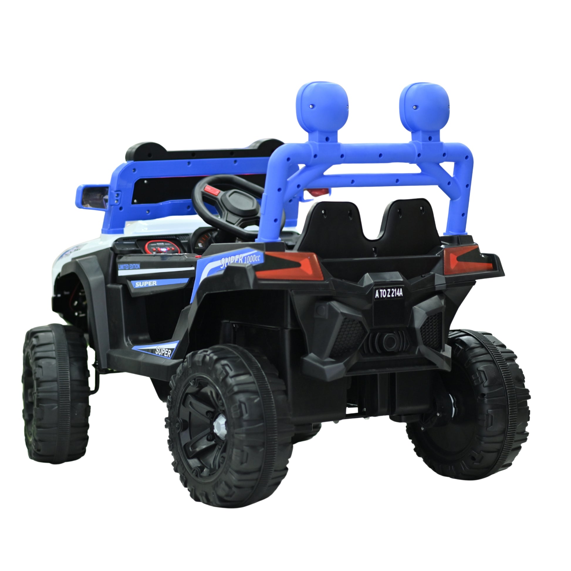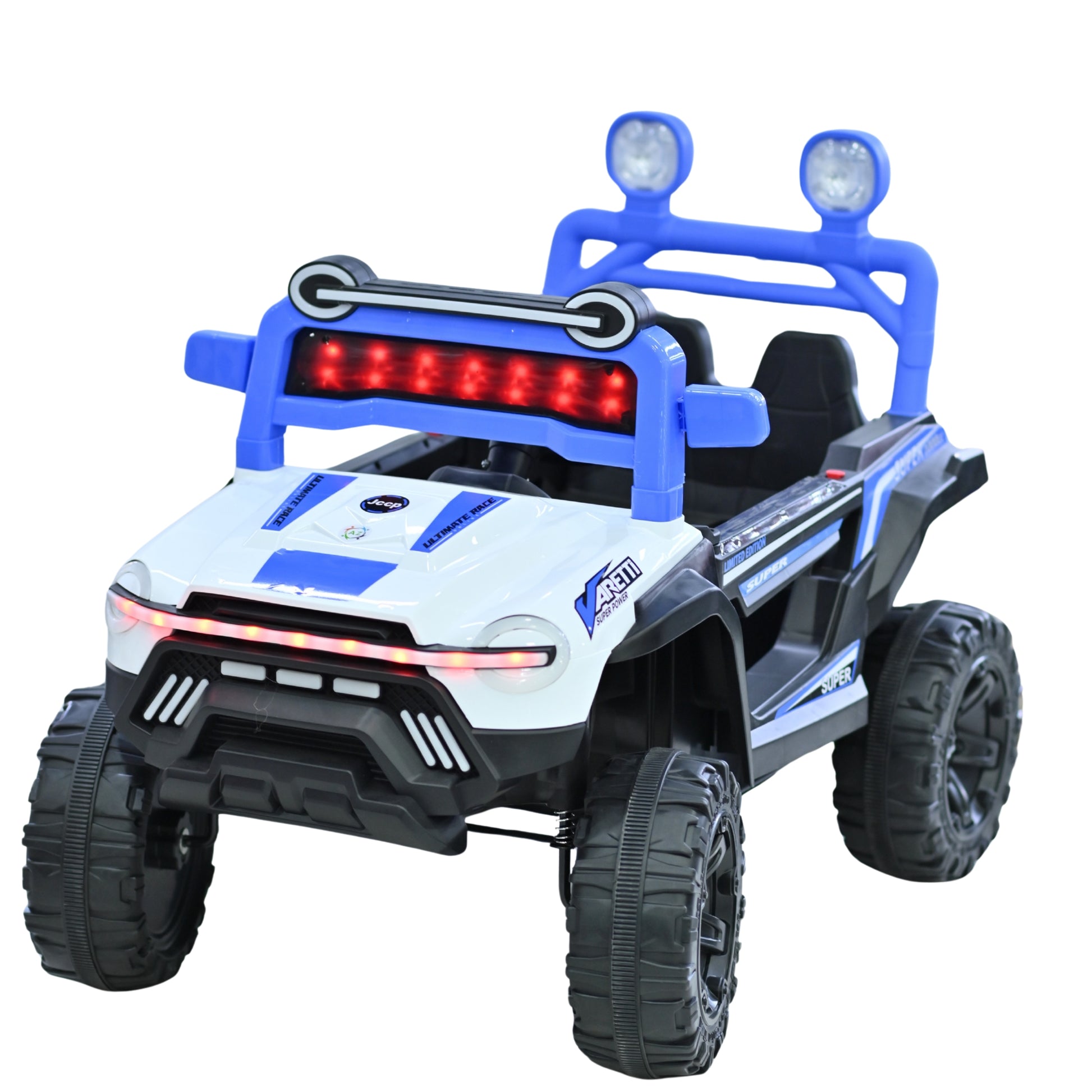 Gear up for action-packed adventures with the Super Ranger Power Jeep Ride-On! This bold ride combines striking white and blue tones with a futuristic LED light bar, rugged all-terrain wheels, and an elevated seat design for a commanding look. Perfect for little explorers aged 3 to 8, it offers a safe yet thrilling drive with dual seats, detailed dashboard, and front grille lights. Whether it’s backyard off-roading or driveway missions, this ride is built to impress and perform!